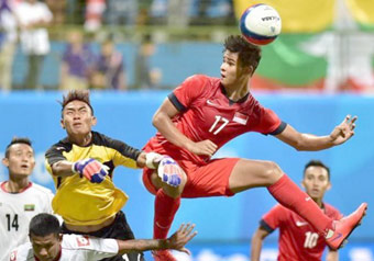 Cầu thủ U23 Singapore (phải) nỗ lực trong trận thua 1-2 trước U23 Myanmar. Ảnh: fourfourtwo |