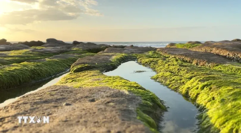Những ngày này, rêu mọc trên những ghềnh đá biển Cổ Thạch - Bình Thạnh, xã Liên Hương, tỉnh Lâm Đồng tạo thành một mảng xanh mướt dọc bãi biển.
