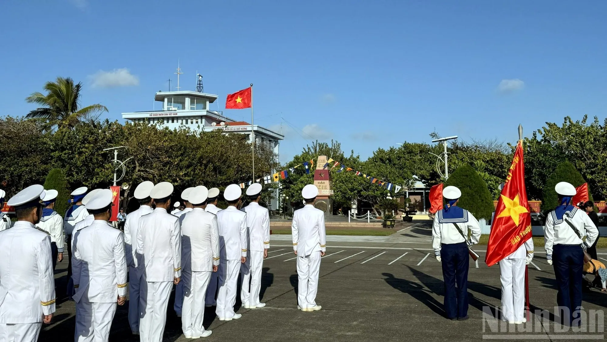 Khi mặt trời vừa nhô lên từ phía biển, gió xuân lồng lộng thổi trên các điểm đảo, cán bộ, chiến sĩ, đại diện chính quyền và nhân dân Trường Sa đã chỉnh tề quân phục, trang nghiêm dự Lễ chào cờ mùng Một Tết.