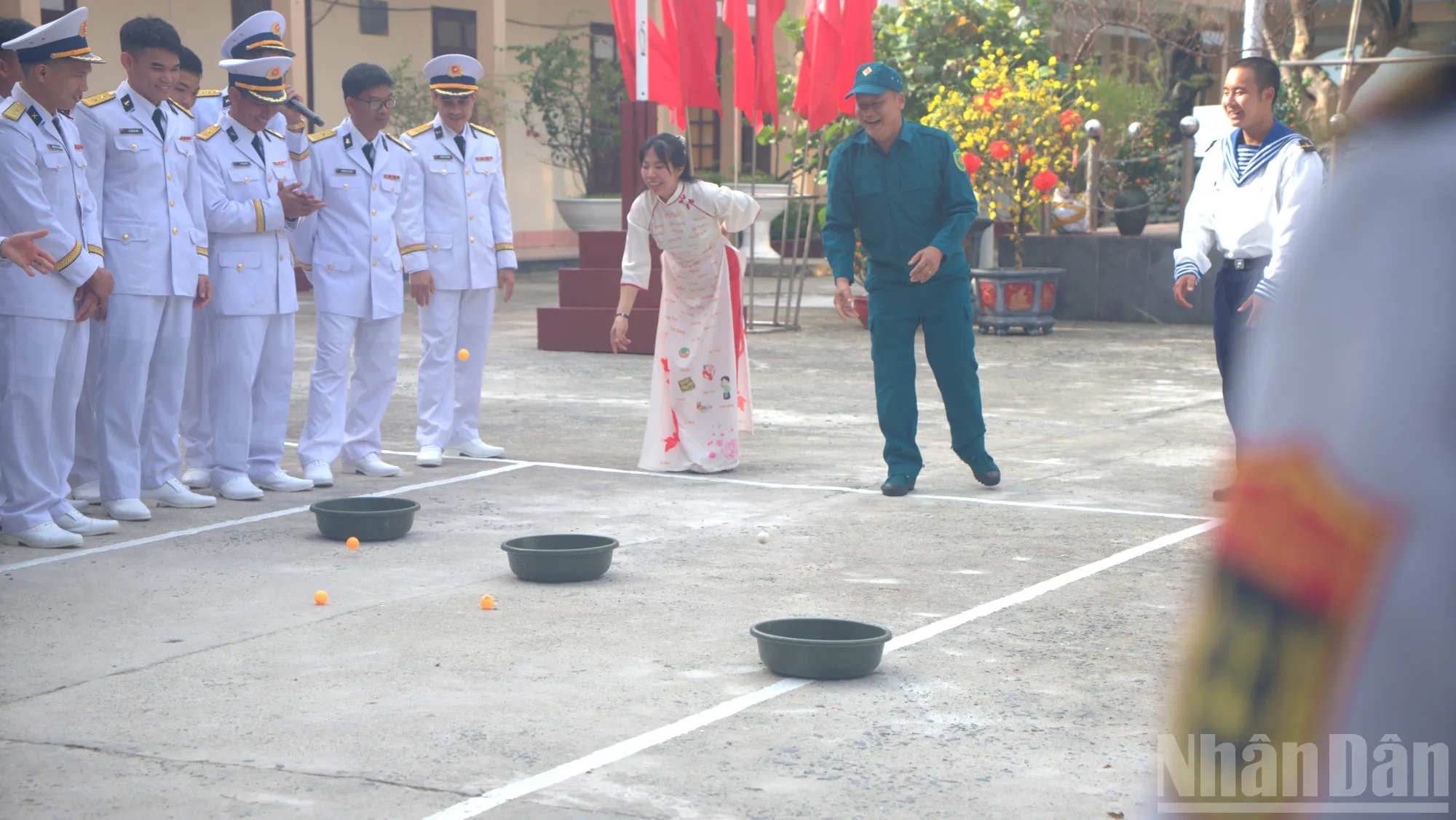 Quân và dân đảo Sinh Tồn tham gia trò chơi thả bóng vào chậu trong ngày mùng Một Tết. (Ảnh: TRUNG HƯNG)