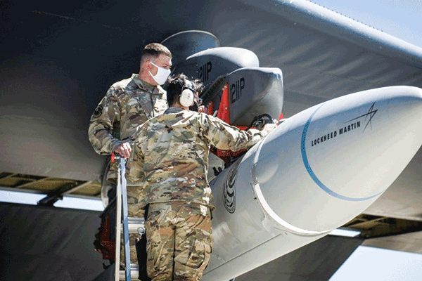 Vũ khí siêu vượt âm được lắp bên dưới chiếc B-52 trước cuộc thử nghiệm tại Căn cứ Không quân Edwards, Mỹ. Ảnh: Reuters