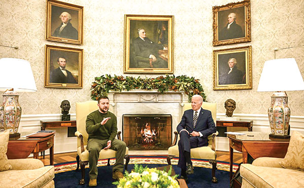 Ðáp lại sự hoan nghênh nhiệt liệt từ các nhà lập pháp Mỹ, Tổng thống Zelensky cho biết hàng chục tỉ USD viện trợ cho Ukraine mà họ đã phê duyệt không phải “từ thiện” mà là đầu tư vào an ninh toàn cầu. Theo ông, cuộc chiến hiện nay có nguy cơ vượt qua ngoài biên giới Ukraine, thách thức các nền dân chủ toàn thế giới. Chính trị gia 44 tuổi dự đoán năm tới sẽ là một “bước ngoặt” trong cuộc xung đột và để tăng cường tính thuyết phục đối với những người còn hoài nghi, ông Zelensky gắn tương lai cuộc chiến và sự tự do với cam kết của Mỹ dành cho Ukraine khi tuyên bố sự hỗ trợ liên tục của Washington chính là chìa khóa dẫn đến chiến thắng cuối cùng. Trước đó vào thứ Tư, ông Zelensky trong cuộc hội đàm với Tổng thống nước chủ nhà Joe Biden, nói rằng chiến tranh sẽ kết thúc khi chủ quyền, tự do và toàn vẹn lãnh thổ của Ukraine được khôi phục. Qua đây, ông tuyên bố không thỏa hiệp.