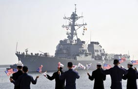 Tàu khu trục mang tên lửa điều khiển USS Lassen (DDG 82) của Mỹ đã đến Hàn Quốc ngày 9-3 để tham gia cuộc tập trận chung. Ảnh: Chosun Ilbo |