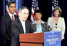 Trước đó, ông Obama đã chọn nhà khoa học đoạt giải Nobel Vật lý năm 1997 Steven Chu, người ủng hộ việc cắt giảm khí thải gây hiệu ứng nhà kính thông qua con đường phát triển các nguồn năng lượng mới, giữ chức Bộ trưởng Năng lượng. Bà Lisa Jackson (cựu Bộ trưởng Môi trường bang New Jersey) làm người đứng đầu Cơ quan bảo vệ môi trường liên bang (EPA), và bà Carol Browner (giám đốc EPA dưới trào Tổng thống Bill Clinton) dẫn dắt hội đồng điều phối của Nhà Trắng về năng lượng, khí hậu và môi trường.