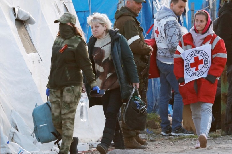 Nhân viên Ủy ban Chữ thập đỏ quốc tế sơ tán dân thường khỏi nhà máy thép Azovstal tại thành phố Mariupol. Ảnh: Reuters