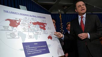 Công tố viên Preet Bharara giải thích đường dây rửa tiền của Liberty Reserve. Ảnh: news.com
