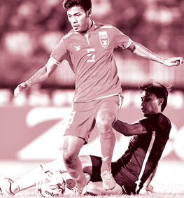 Aung Thu (9) là cầu thủ chơi nổi bật của Myanmar, giúp đội nhà có kết quả tốt trước Malaysia. |