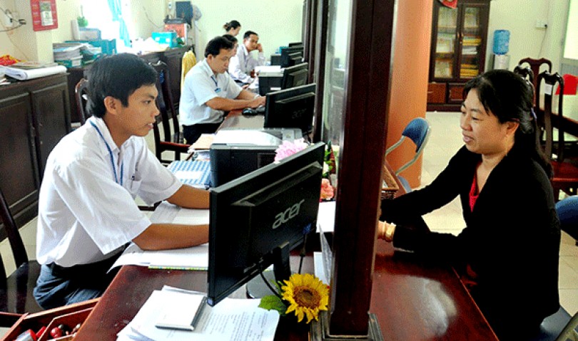 Công chức bộ phận một cửa xã Trường Xuân B giải quyết thủ tục hành chính cho người dân.