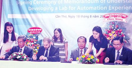 Vườn ươm Công nghệ Công nghiệp Việt Nam Hàn Quốc tại TP Cần Thơ (KVIP), Hội Tự động hóa Cần Thơ, Khoa Công nghệ Trường Đại học Cần Thơ và Công ty TNHH SIEMENS Việt Nam ký kết Hợp tác phát triển Phòng Kiểm chứng Công nghệ tự động hóa đặt tại KVIP. Ảnh: MINH HUYỀN |