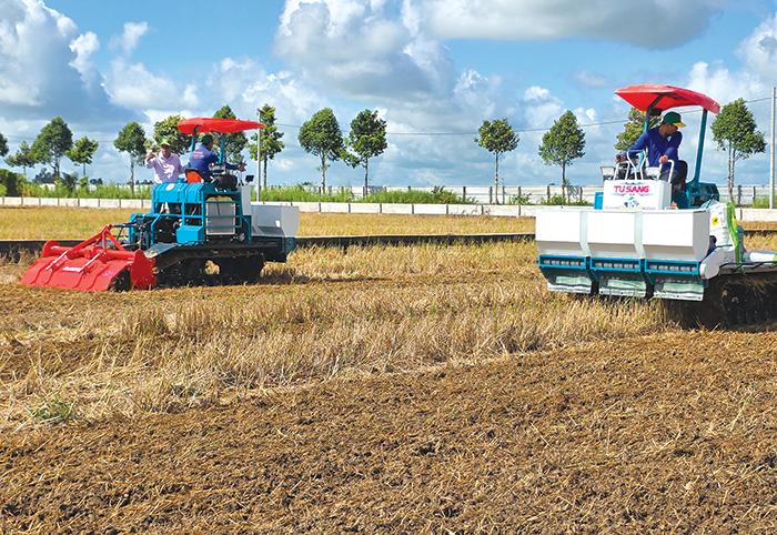 Trình diễn máy móc, công nghệ xử lý gốc rạ trên ruộng lúa để tạo nguồn hữu cơ cho đất tại Viện Lúa ĐBSCL ở TP Cần Thơ.