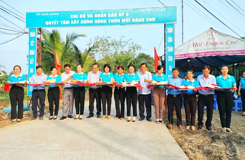 Lãnh đạo Huyện ủy Cờ Đỏ và Hội LHPN huyện, cắt băng khánh thành công trình “Tuyến đường đèn trước ngõ sáng - xanh- sạch - đẹp” tại ấp 3, xã Thới Hưng do Hội LHPN huyện vận động thực hiện. Ảnh: Hội LHPN huyện cung cấp