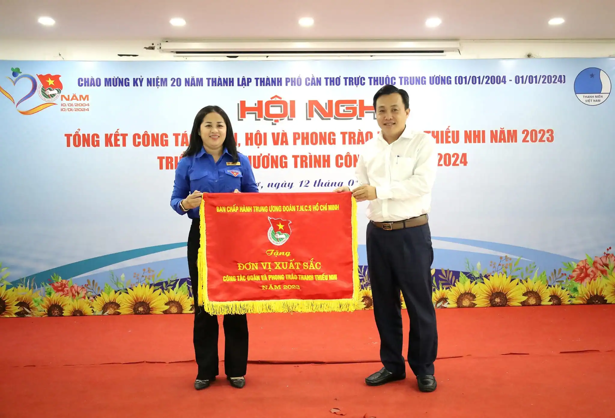Lãnh đạo Ban Dân vận Thành ủy Cần Thơ trao Cờ đơn vị xuất sắc công tác Đoàn và phong trào thanh thiếu nhi năm 2023 của Trung ương Đoàn cho tuổi trẻ thành phố. Ảnh: CTV
