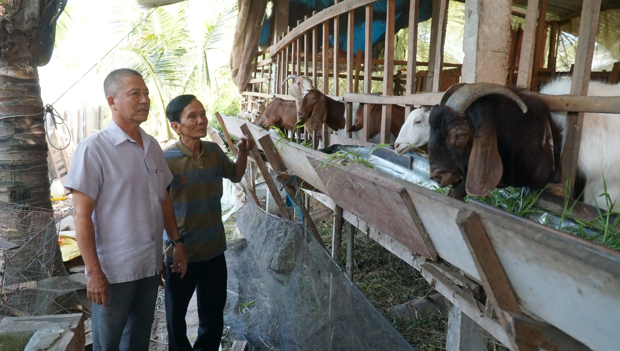 Ông Trần Văn Chín ở khu vực Phúc Lộc 1 (bên phải) được hỗ trợ vay vốn phát triển mô hình nuôi dê, lời 150 triệu đồng/năm.