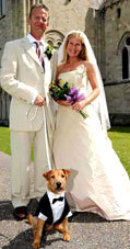 Harriet và Andrew gặp nhau lần đầu khi cả hai đang tản bộ cùng với chó cưng của mình dọc bãi biển Mudeford ở Dorset (Tây Nam nước Anh) hồi tháng 8 năm ngoái. Trong lúc ba con chó chơi đùa với nhau, hai người cũng bắt đầu chào hỏi và trò chuyện ít phút. Cảm thấy thích thú với chiếc vòng cổ lấp lánh của Ed, Andrew hỏi Harriet đã mua nó ở đâu và cô gái cho biết mình đang điều hành công ty kinh doanh phụ kiện dành cho thú cưng. Ngay sáng hôm sau, Harriet nhận được đơn đặt hàng là chiếc vòng cổ lấp lánh màu hồng cùng với lời mời đi uống nước của Andrew, và họ thân nhau từ đó. Tháng 1-2008, Andrew chính thức cầu hôn Harriet. Trong hôn lễ vừa qua, chú chó Ed mặc bộ lễ phục sang trọng (ảnh) còn Humbug và Goulash đeo vòng cổ màu hồng xinh xắn, tháp tùng cô dâu chú rể tiến vào giáo đường.