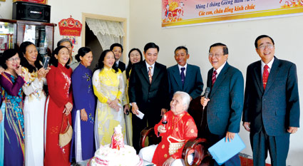 Các thành viên trong tộc họ Nguyễn Hữu quây quần chúc Tết cụ bà Nguyễn Khiêm Hòa dịp Tết Ất Mùi 2015. Ảnh do họ tộc cung cấp |