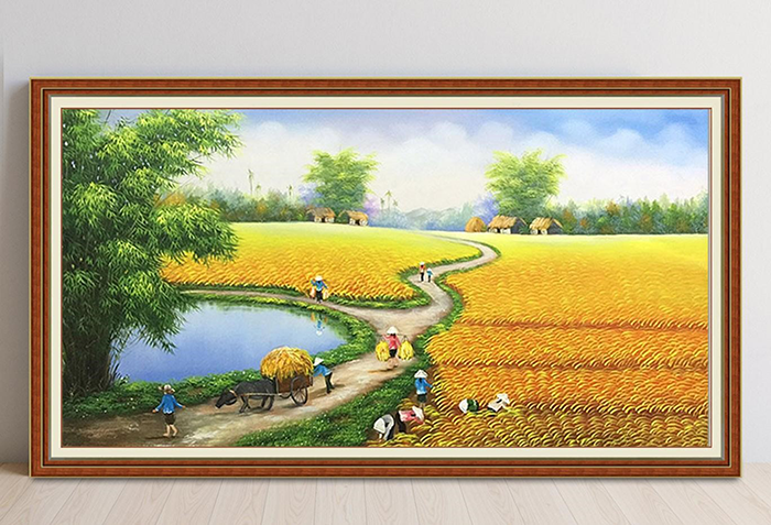 Khi nhắc tới phong cảnh làng quê Bắc Bộ xưa thì những bức tranh về đồng lúa chín vàng vào vụ thu hoạch luôn rất được ưa chuộng. Màu vàng của lúa chín khiến bức tranh mang vẻ đẹp nổi bật, nhìn sáng và sang, nó cũng là màu của tài lộc mang ý nghĩa "mùa vàng bội thu".