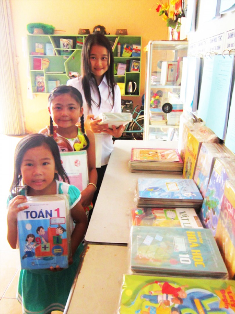 CLB Tấm lòng vàng còn vận động sách giáo khoa cũ, tập vở, cặp da, học bổng để tặng học sinh có hoàn cảnh khó khăn. Đầu năm học 2017-2018, CLB đã tặng 40 cặp da, 400 cuốn tập và trên 20 bộ SGK cũ cho các em học sinh. Những bộ SGK còn lại được trưng bày ở kệ tủ của Nhà thông tin khu vực để ai cần có thể chọn lựa. Cầm trên tay bộ SGK lớp 1 và tập vở để đi học, bé Trần Như Ngọc, con gái chị Trần Thị Thủy Tiên, vui mừng vô cùng, bởi tuy tựu trường vài ngày rồi nhưng vì gia cảnh khó khăn nên mẹ chưa mua được sách vở đầy đủ cho em. Chị Thủy Tiên chia sẻ: “Nhờ khu vực cho sách, tập, tôi cũng nhẹ gánh lo phần nào!”.