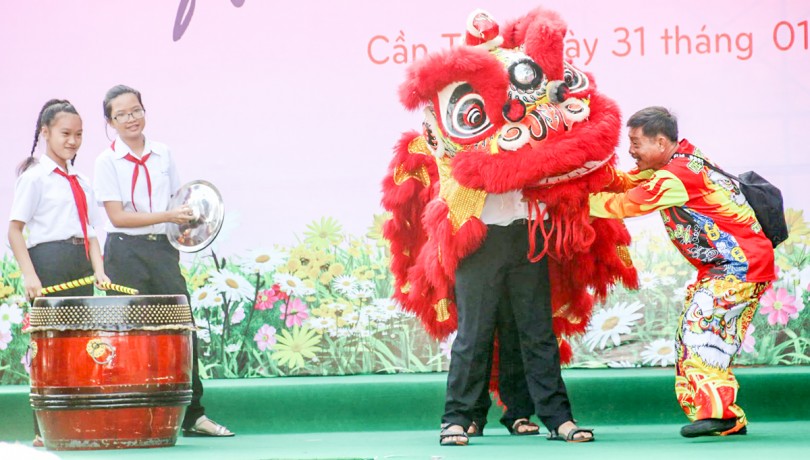 Học sinh tập múa lân qua sự hướng dẫn của nghệ nhân đến từ Đoàn Lân- Sư- Rồng Việt Anh Đường.