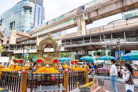 Erawan Shrine is a Hindu shrine located in front of Grand Hyatt Erawan Hotel at the Ratchaprasong intersection on Ratchadamri Road in Lumphini Sub-district, Pathum Wan district, Bangkok. (Photo: tourismthailand.org)