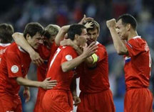 Niềm vui chiến thắng của các cầu thủ Nga khi hạ Hy Lạp 1-0. |