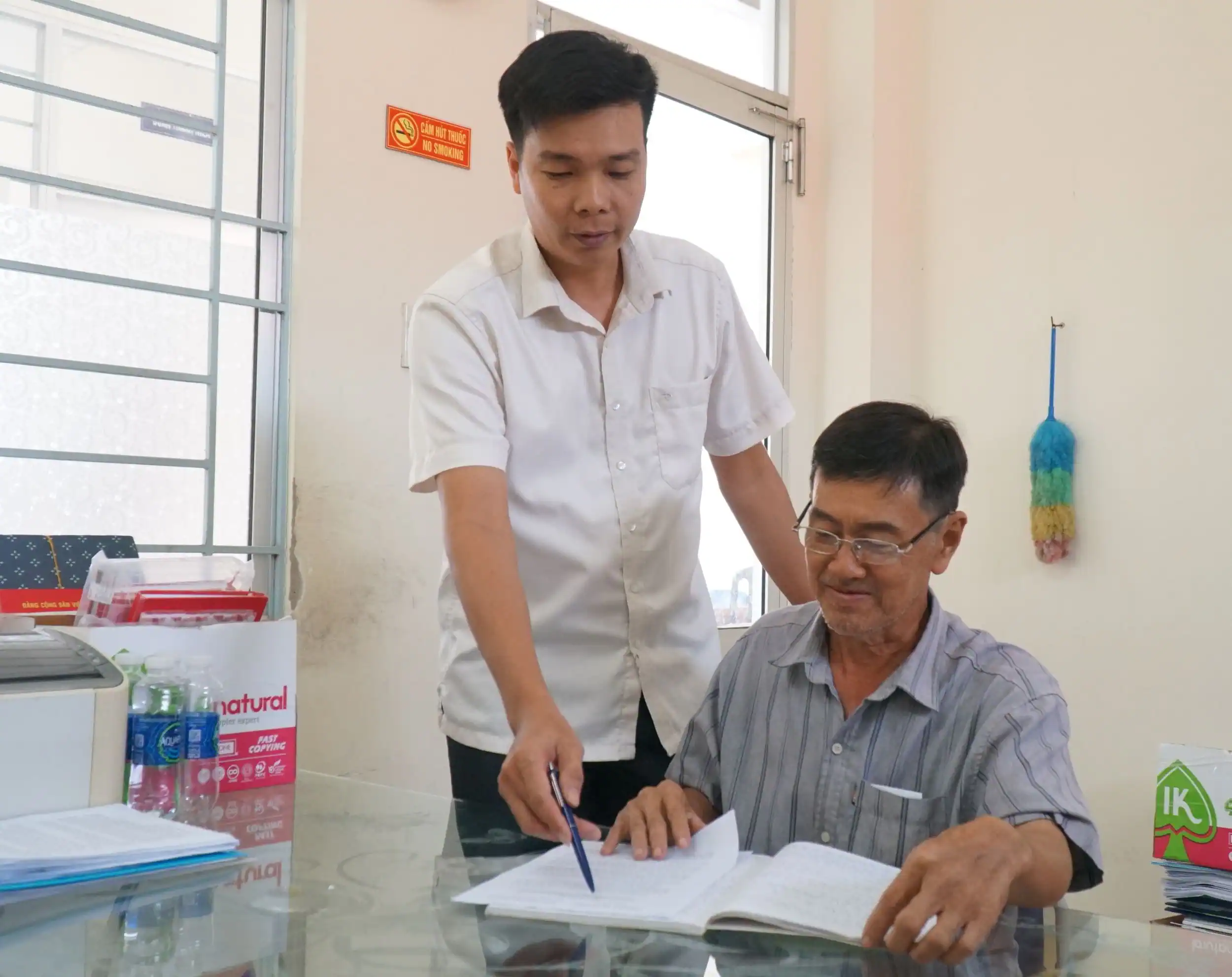 Cán bộ Ủy ban Kiểm tra Đảng ủy phường Thường Thạnh hướng dẫn Bí thư Chi bộ, Trưởng khu vực Phú Quới về phương pháp quản lý đảng viên.