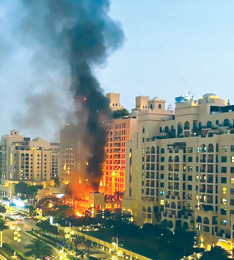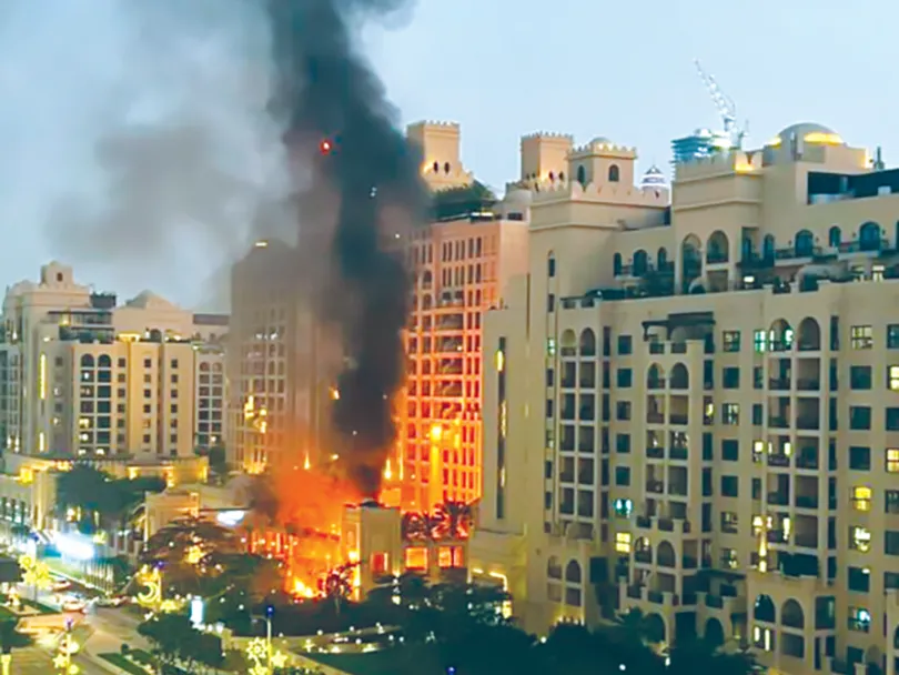 Khách sạn sang trọng Fairmont ở Dubai bốc cháy do trúng mảnh vỡ tên lửa. Ảnh: CNBC
