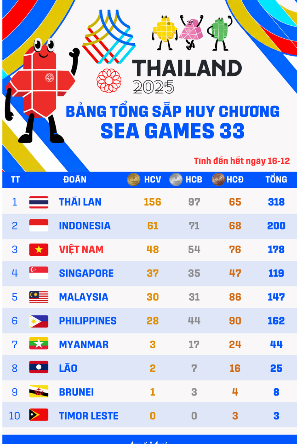 Bảng tổng sắp huy chương SEA Games 33 đến hết ngày 16-12. Ảnh: tuoitre.vn