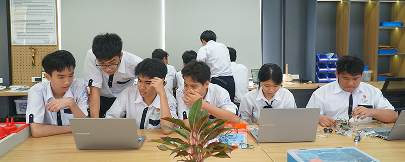 Học sinh Trường THPT Chuyên Lý Tự Trọng thực hành tại phòng thực hành giáo dục STEM. Ảnh: B.NG