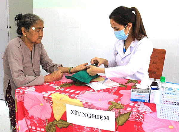 Cán bộ y tế lấy mẫu xét nghiệm kiểm tra đường huyết của người bệnh.
