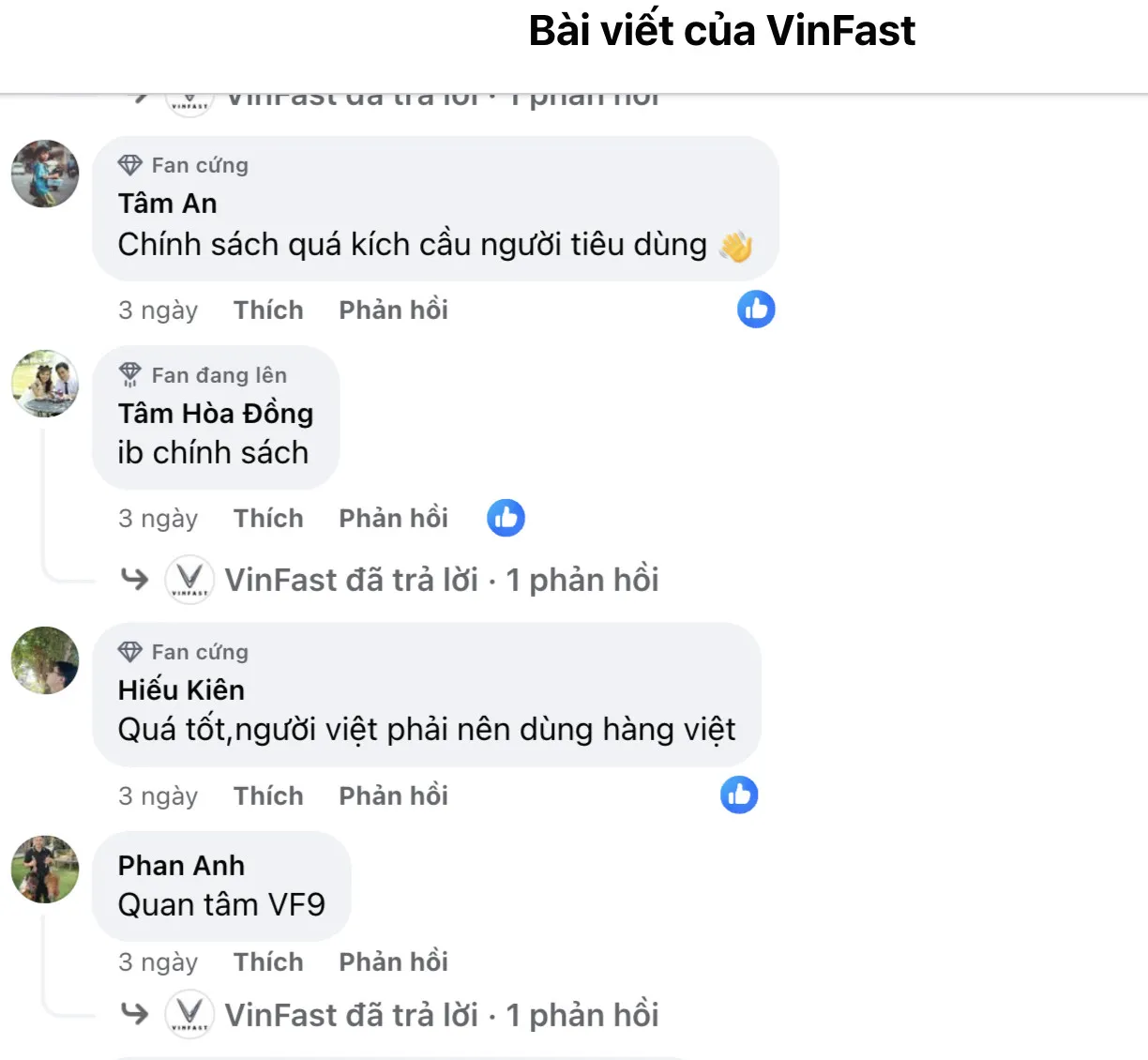 Hàng loạt bình luận trên fanpage của VinFast cho thấy sự quan tâm và hài lòng của người dùng với chính sách mới của hãng xe Việt