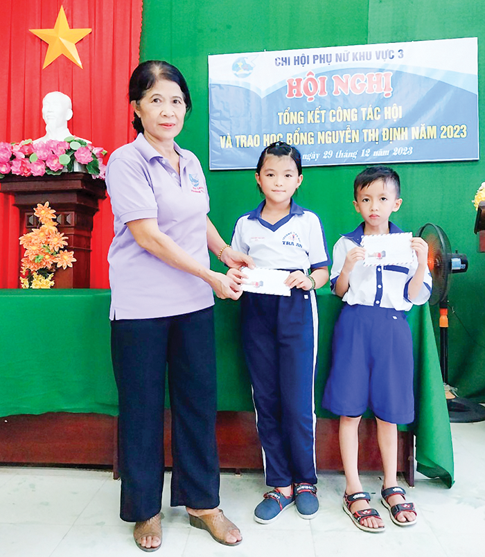 Cô Nguyễn Thị Hồng Thái thay mặt Chi hội Phụ nữ khu vực 3 trao học bổng cho các em học sinh nghèo hiếu học năm 2023.