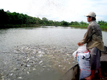 Trong ảnh: Nông dân nuôi cá tra đang cho cá ăn. |