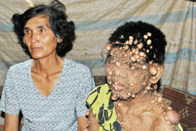 5 năm gần đây, bà Sà Phay gầy còm hơn và luôn sống trong nước mắt khi những khối u của Sa Ly ngày càng to dần, biến dạng. Đau nhức không đi lại được, gần như mọi sinh hoạt cá nhân của Sa Ly phải nhờ bà trợ giúp. Bà Sà Phay kể: “Lúc mới sinh ra, Sa Ly bình thường như 7 đứa con khác trong gia đình. Đến hơn 1 tuổi, phía sau lưng nó có vài mụt bướu da nhỏ. Tôi tưởng đó là những mụt mụn bình thường nào ngờ khi Sa Ly lớn lên thì những mụt này cũng lớn theo, to dần, nổi khắp thân mình như trái sung”.