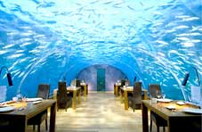 Những ai có dịp đến đảo quốc Maldives ở Ấn Độ Dương nên một lần ghé qua nhà hàng dưới nước đầu tiên trên thế giới ở khu nghỉ mát Conrad Maldives Rangali. Mang phong cách hồ thủy sinh, nhà hàng “Ithaa” được xây dựng toàn bộ bằng kính nằm cách mặt biển 5 m, tại đây thực khách có thể ngắm nhìn toàn cảnh đời sống sinh vật biển.