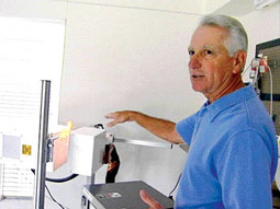 Kanzius đang đốt cháy nước biển bằng máy phát tần số vô tuyến do ông chế tạo. Ảnh: World Net Daily |