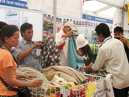 Doanh nghiệp muốn cạnh tranh với NHR cần liên tục thay đổi công nghệ, mẫu mã sản phẩm... (DN ngành may mặc bán hàng tại Hội chợ hàng Việt Nam chất lượng cao). Ảnh: T.H