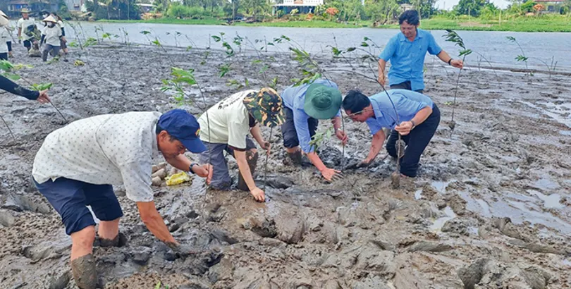 Các lực lượng tham gia trồng cây bần ở khu vực bãi bồi gần Cồn Sơn, phường Bùi Hữu Nghĩa.