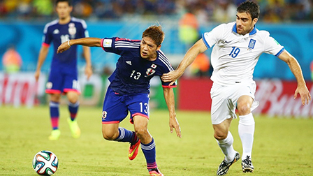 Mỗi khi các cầu thủ Nhật Bản có bóng thì có 2- 3 hậu vệ Hy Lạp áp sát để cản phá, làm cho các các chân sút “samurai” không có khoảng trống để dứt điểm. Trong thế trận chiếm ưu thế về mặt kiểm soát bóng, nhưng nhà tổ chức M.Hassebe chưa có đường chuyền hợp lý cho đồng đội. Những pha tấn công của Nhật Bản không có sự biến hóa, chưa có đột phá nên không kéo giãn được tuyến phòng ngự Hy Lạp.