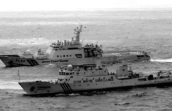 Tàu hải giám Trung Quốc (trước) và tàu của Lực lượng Bảo vệ Bờ biển Nhật Bản trong vùng lãnh hải gần quần đảo tranh chấp. Ảnh: Asahi Shimbun. |