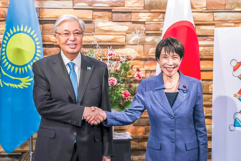 Thủ tướng Nhật Bản Sanae Takaichi (phải) gặp Tổng thống Kazakhstan Kassym-Jomart Tokayev tại Tokyo hôm 18-12. Ảnh: AFP