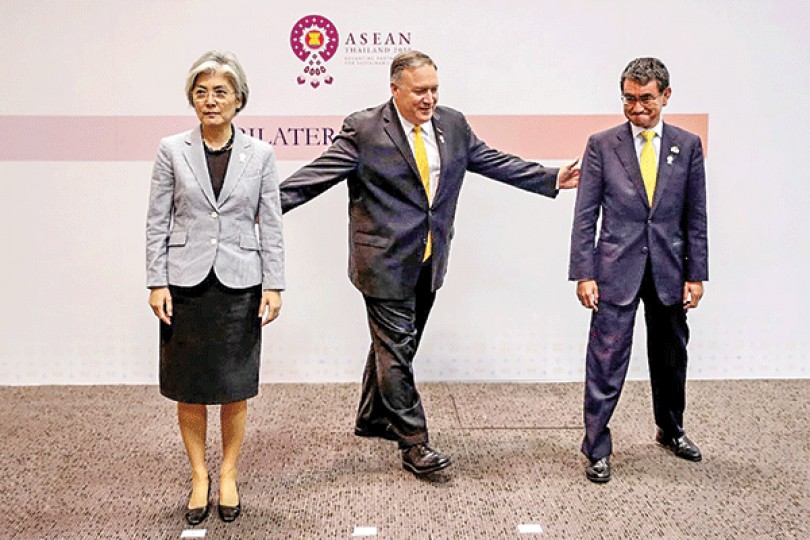 Ngoại trưởng Mỹ Mike Pompeo (giữa) cố hòa giải giữa Ngoại trưởng Nhật Taro Kono (phải) và người đồng cấp Hàn Quốc Kang Kyung-wha hồi tháng 8-2019. Ảnh: AFP