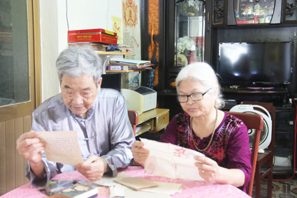 Ông bà An Ninh bồi hồi bên kỷ vật con trai- Liệt sĩ Lê Văn. Ảnh: DUY KHÔI |