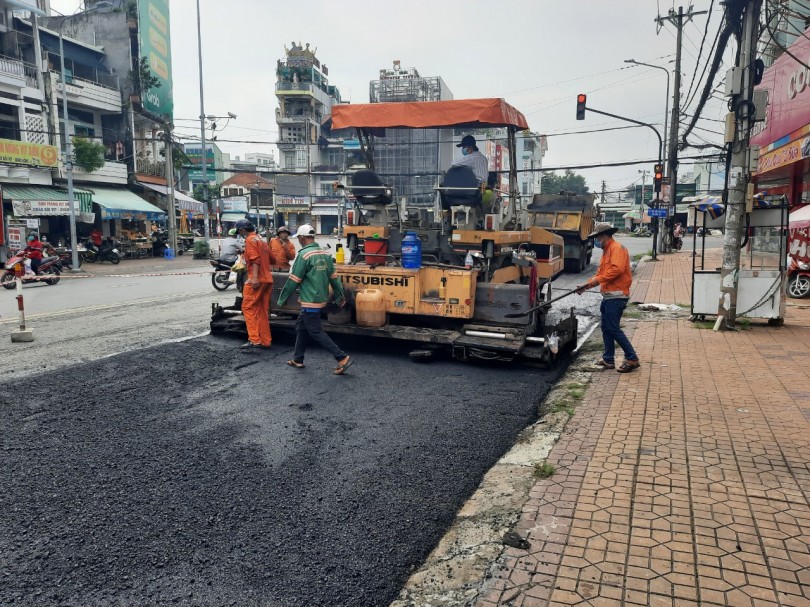 Đơn vị thi công giặm vá đường trên địa bàn quận Ninh Kiều. Ảnh: Phòng Quản lý đô thị quận cung cấp.
