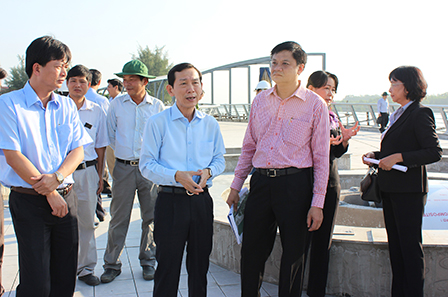 Cầu đi bộ đã cơ bản hoàn thành. Trong ảnh: Lãnh đạo UBND TP Cần Thơ đi kiểm tra tiến độ thi công công trình cầu đi bộ gần đây.