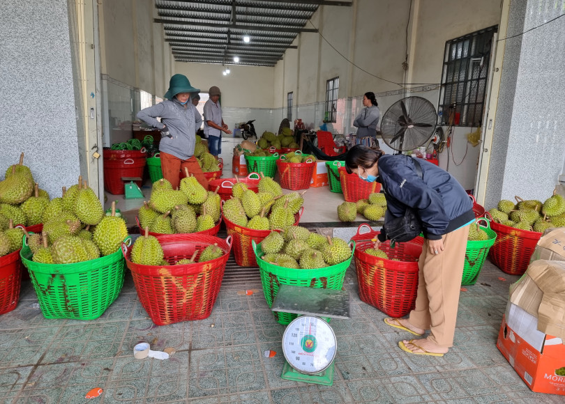 Thu mua sầu riêng tại một vựa trái cây ở tỉnh Bến Tre.