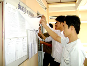 Người dân xã Tân Thạnh (huyện Thới Lai) tìm hiểu Chỉ thị số 02/CT-UBND của Chủ tịch UBND thành phố về chấn chỉnh một số hoạt động trong giải quyết thủ tục hành chính, được niêm yết công khai tại trụ sở UBND xã. Ảnh: THANH NHỊ |