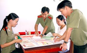 Thượng úy Lê Thị Kiều Loan - Đội phó Đội Tham mưu tổng hợp, Thanh tra Công an TP Cần Thơ (bìa trái) cùng đồng nghiệp trong đơn vị tham gia làm báo tường kỷ niệm ngày truyền thống Thanh tra Công an.