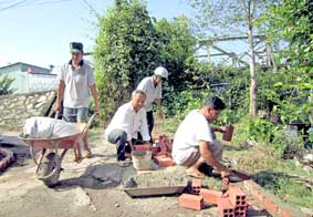 Ông Võ Văn Hai (thứ hai, ngồi, từ trái sang) tham gia làm đường với bà con. |