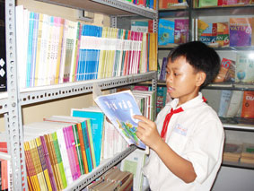 Lê Thiên Kỳ tham khảo sách trong thư viện trường. |
