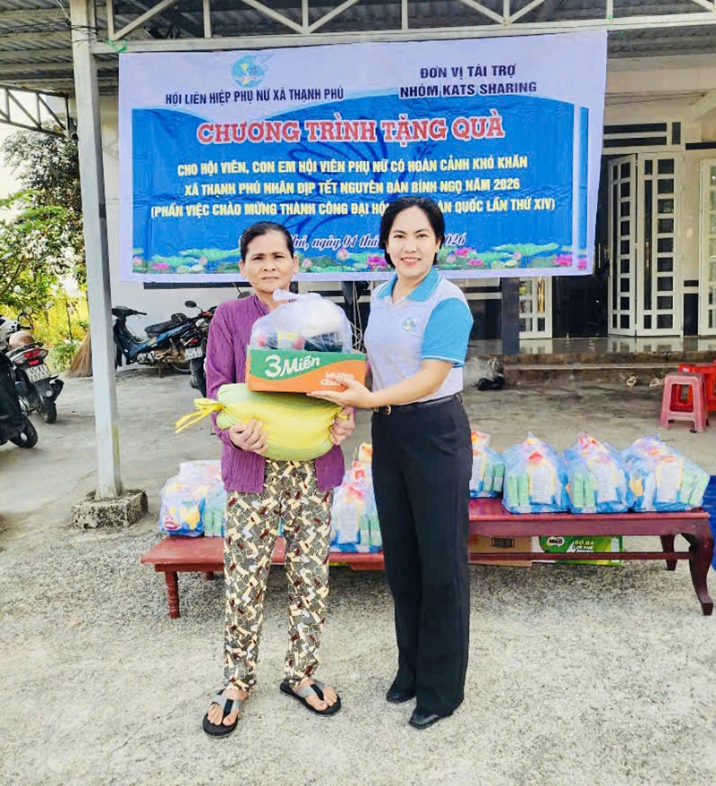 Chị Hồ Thị Bảo Trân tặng quà hội viên phụ nữ hoàn cảnh khó khăn dịp Tết Nguyên đán Bính Ngọ 2026.